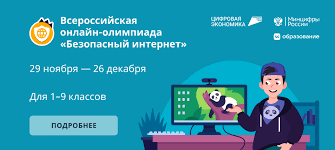 02.12.2022Всероссийская онлайн-олимпиада «Безопасный интернет» для учеников 1-9 классов пройдёт с 29 ноября по 26 декабря 2022 года. Олимпиада проводится образовательной онлайн-платформой Учи.ру и компанией VK при поддержке национального проекта «Цифровая экономика» и Минцифры России. Участие для всех школьников из всех регионов бесплатное.