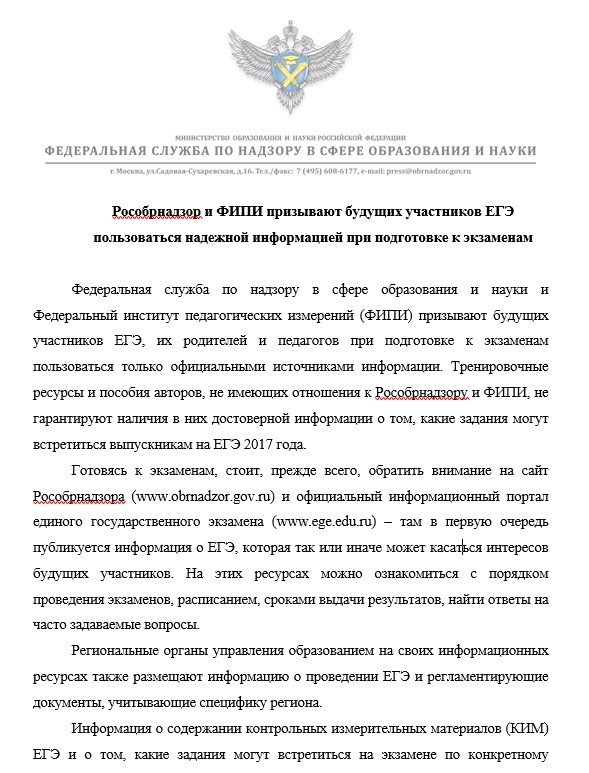 Рособрнадзор и ФИПИ призывают будущих участников ЕГЭ пользоваться надежной информацией при подготовке к экзаменам.